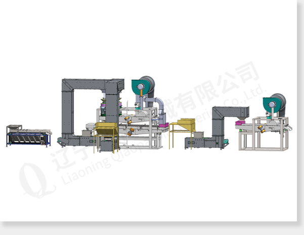 Dehulling & separating unit consists of input hopper, Z-type elevator, dehuller ( for 1st time dehulling), separating sieve, C-type elevator (elevating unhulled walnuts to dehuller), dehuller (for 2nd time dehulling).