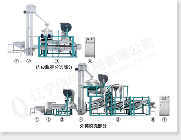 內(nèi)皮脫殼分選部分:① 上料斗 ② 斗式提升機(jī) ③ 脫殼、風(fēng)選、分選主機(jī) ④ 電控柜
