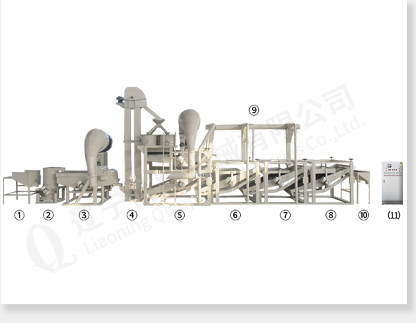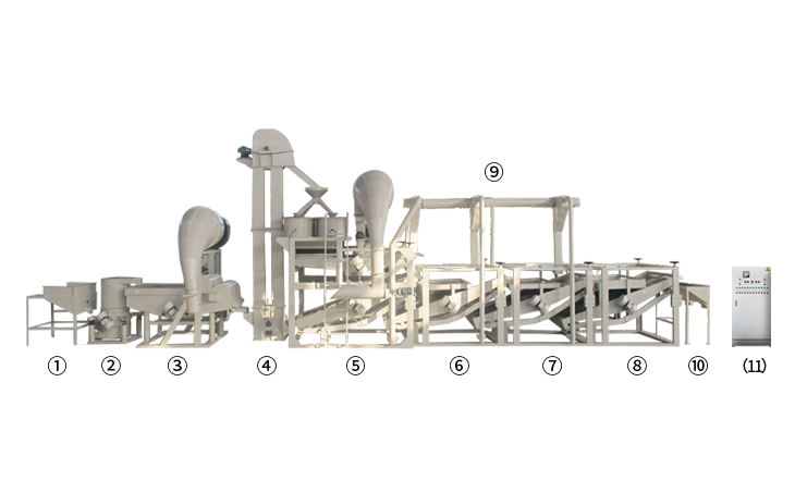 上料斗原料提升機(jī) 多功能除雜機(jī) 斗式提升機(jī) 脫殼、風(fēng)選、分選主機(jī) 籽仁復(fù)選機(jī)1 籽仁復(fù)選機(jī)2 籽仁復(fù)選機(jī)3  風(fēng)力回料系統(tǒng) 接料斗 (11) 電氣控制柜