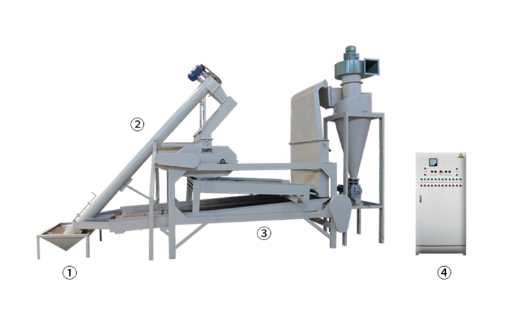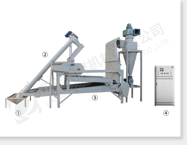 ① 上料斗 ② 絞龍螺旋輸送機(jī) ③ 脫殼、風(fēng)選、分選主機(jī) ④ 電氣控制柜